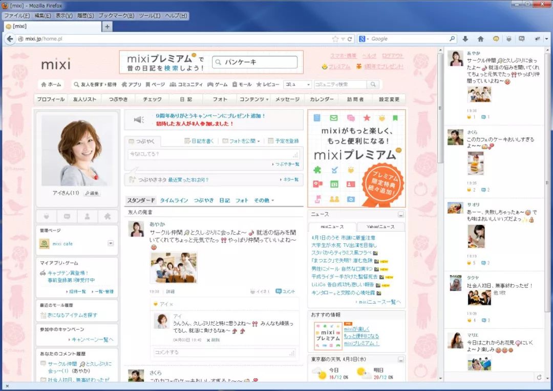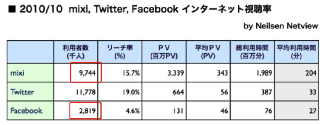 它的定位跟Facebook类似,也是让用户在网上写博客,放照片,还有关注好友的动态,有趣的是Facebook也是2004年2月创立的。Mixi的卡通化风格非常受日本人欢迎,截止2006年,Mixi的注册用户达到480万,是当时日本用户量最大的社交网站。早期Facebook进入日本遇到不少阻力,原因就是Mixi的先入为主,日本很多学生觉得Facebook的本土信息不多,操作复杂且明显没有Mixi受欢迎,因此用的人不多。根据尼尔森2010年的数据,Mixi在日本的用户数达到974万人,是同期Facebook的3.5倍左右。