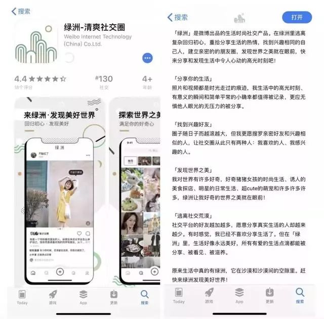 左小红书,右绿洲"绿洲"团队想要避免的就是这些(社交荒漠),想让平台成为用户无压力分享生活点滴的平台。