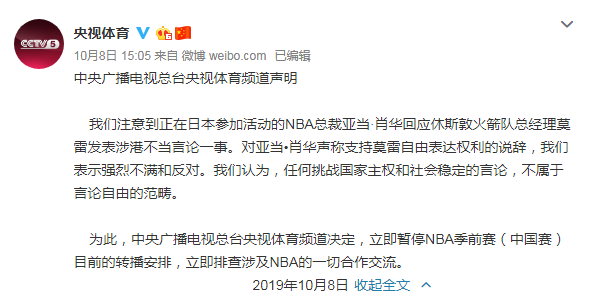 8日下午,中央广播电视总台央视体育频道发布声明称,立即暂停NBA季前赛(中国赛)目前的转播安排,立即排查涉及NBA的一切合作交流。