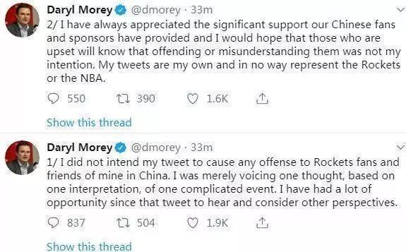 “我无意通过自己的推特冒犯火箭队粉丝和我在中国的朋友们。我只是基于某种阐释,对一个复杂事件表达某一种想法。自那条推特发出以后,我有机会倾听和思考其他(思考问题的)角度。”