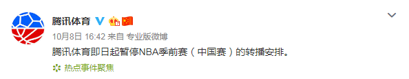 此后,腾讯体育方面也发布声明称,即日起暂停NBA季前赛(中国赛)的转播安排。