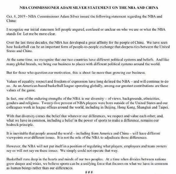 同一天,NBA布鲁克林篮网队的新老板、阿里巴巴集团董事局执行副主席蔡崇信向所有NBA球迷发表了一封公开信。他表示,作为NBA30支球队其中一支的老板,也作为一个在中国度过了职业生涯大部分时光的炎黄子孙,他必须发声。