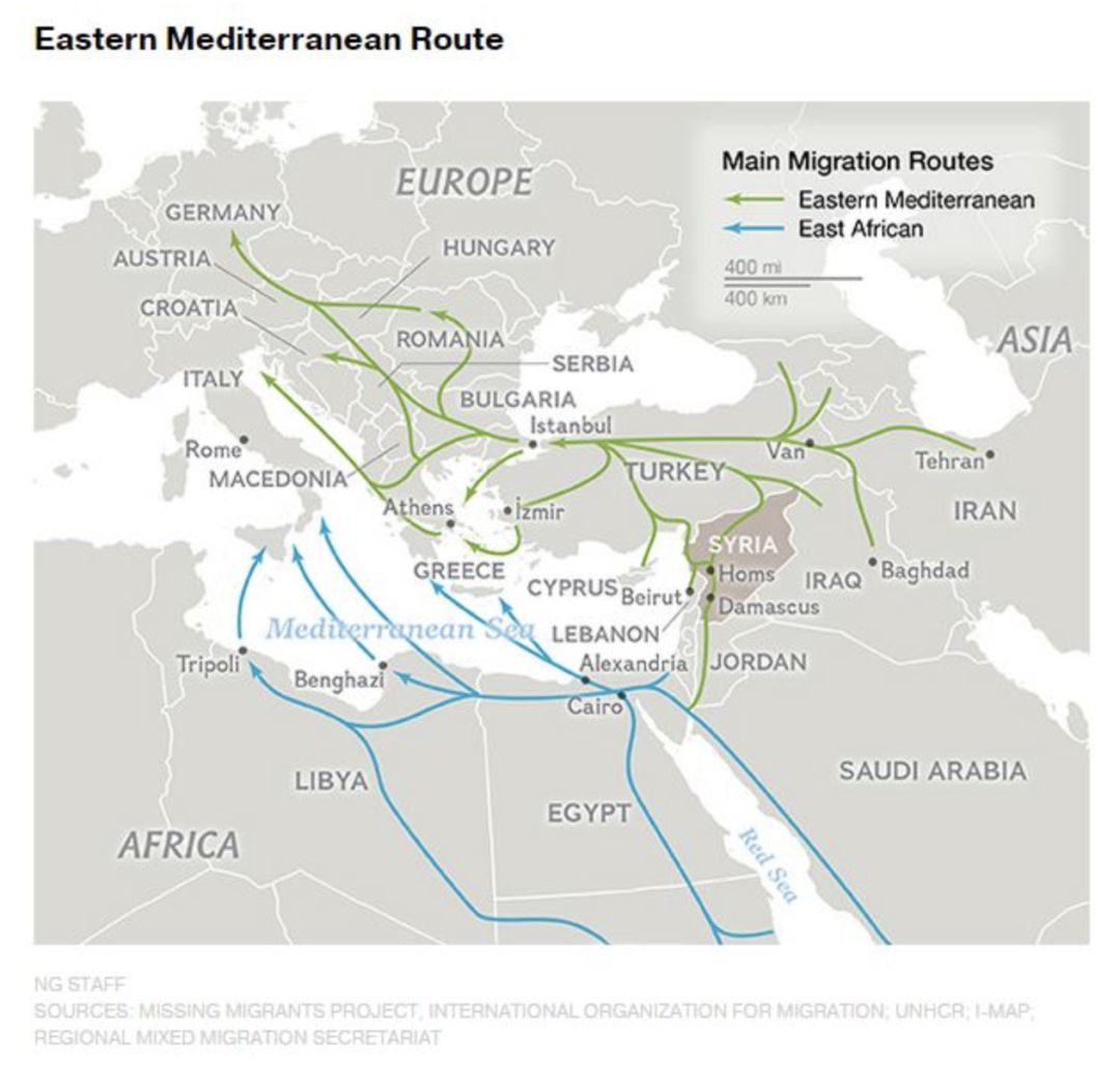 东地中海偷渡路线图(来源:国际移民组织官网)