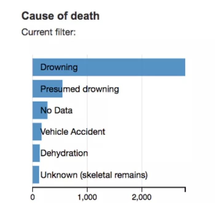 从非法移民的死因,我们或许能窥见他们在路上所遭遇的险难。国际移民组织的全球移民数据分析中心统计数据显示,在2019年,溺水成为非法移民主要死因,其次是交通事故。而在地中海地区遇难的非法移民,大多数是因溺水而亡。