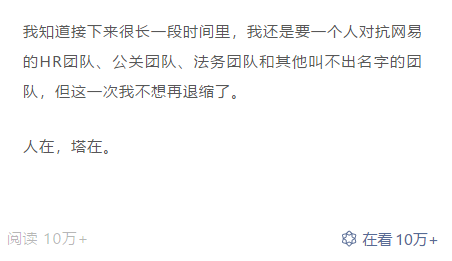 最后,该控诉者写道:“我知道接下来很长一段时间里,我还是要一个人对抗网易的HR团队、公关团队、法务团队和其他叫不出名字的团队,但这一次我不想再退缩了。人在,塔在。”