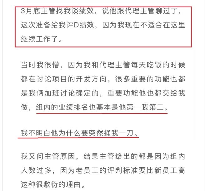 作者表示,今年1月底,他被确诊为扩张型心肌病,接着3月底主管给这名员工评为D绩效,并对该员工表示,他现在不适合在这里继续工作了。