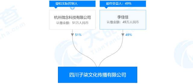天眼查信息显示,李子柒名下有一家公司,名为四川子柒文化传播有限公司,李子柒跟她的经纪公司各占49%和51%的股份。
